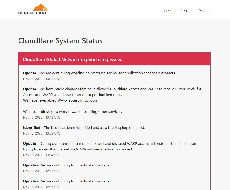 Cloudflare, amerykański dostawca usług internetowych i zabezpieczeń sieciowych, poinformował we wtorek o usunięciu problemów technicznych, które przez około sześć godzin powodowały zakłócenia w działaniu licznych stron (w tym Aktualnosci.be) i aplikacji na całym świecie. Incydent dotknął setki tysięcy firm korzystających z usług tego kluczowego gracza na rynku infrastruktury internetowej.