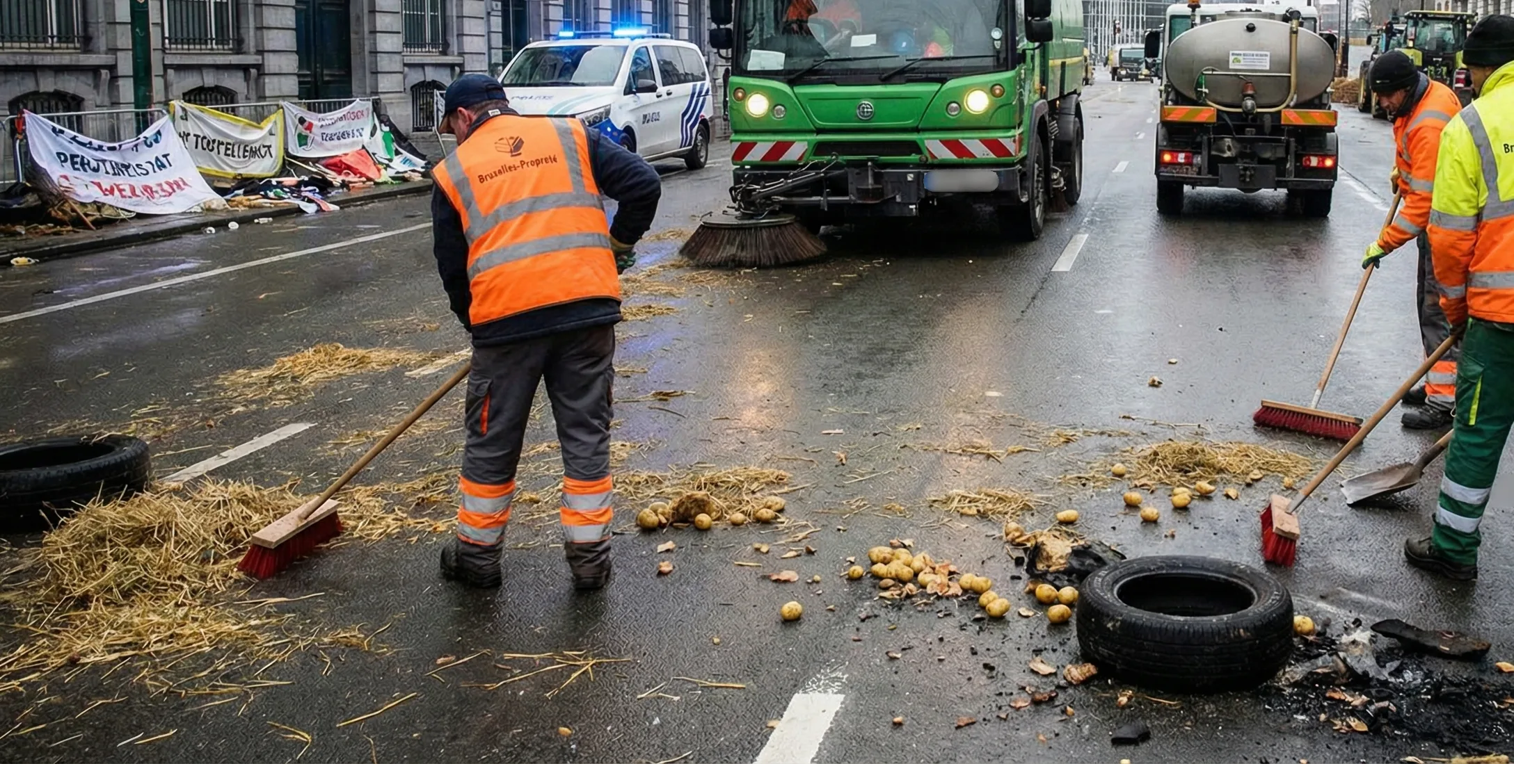 Strona główna BelgiaBrukselaZiemniaki, odpady i zniszczenia. Sprzątanie po proteście w Brukseli