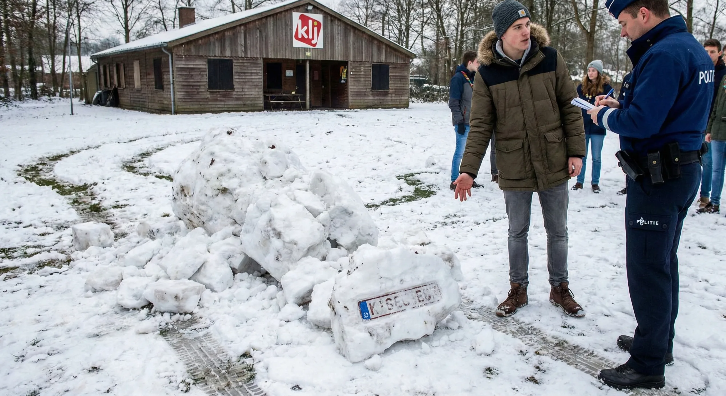 Kierowca celowo zniszczył bałwana ulepionego przez młodzieżówkę KLJ w Halle-Zoersel. Numer rejestracyjny odcisnął się w śniegu