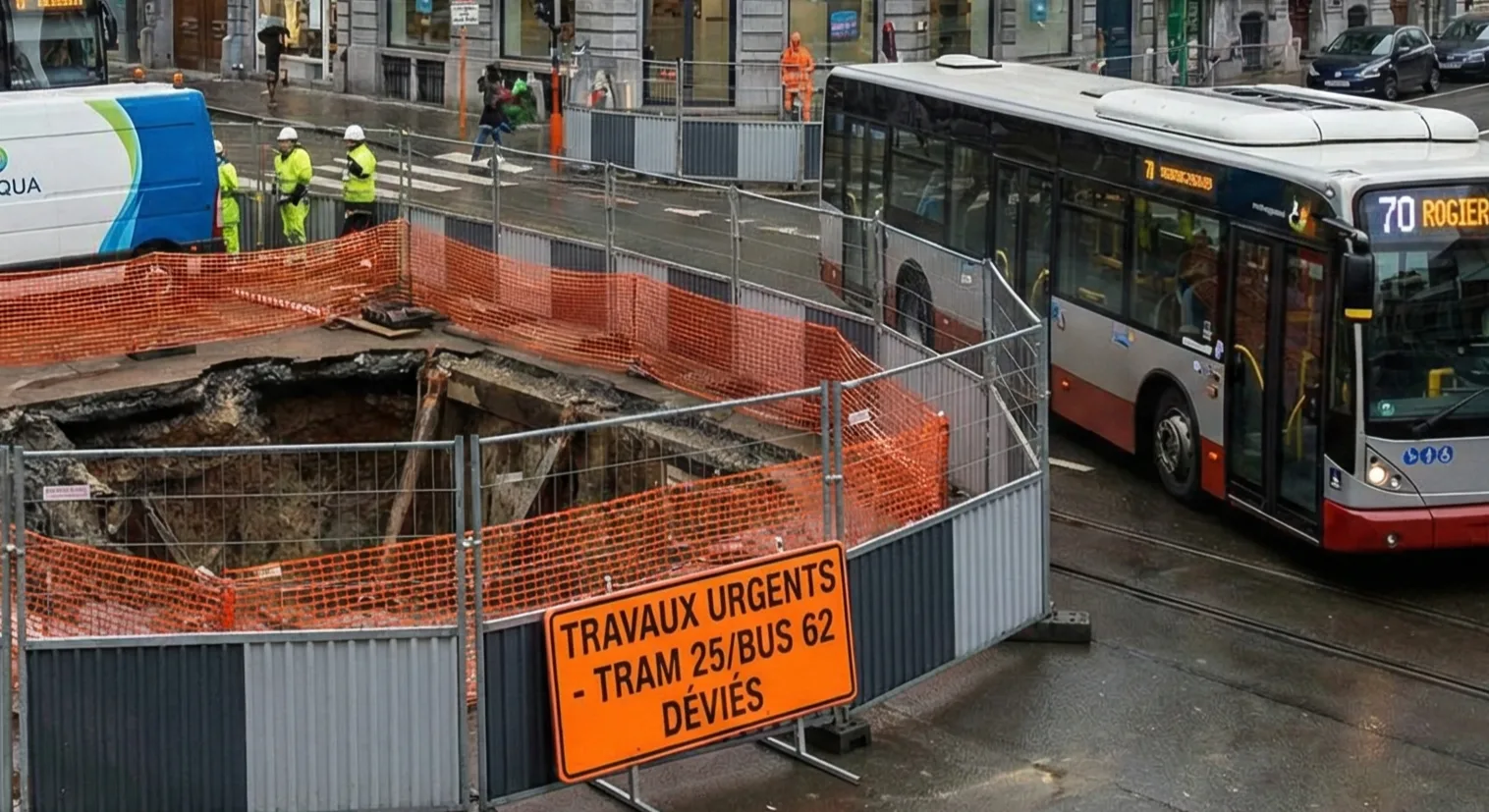 Przedsiębiorstwo wodociągowe Vivaqua rozpoczęło awaryjne prace przy rue Rogier na Schaerbeek. W związku z robotami linia tramwajowa 25 oraz linia autobusowa 62 zostały skierowane na trasy objazdowe. Utrudnienia mają potrwać około dwóch tygodni. Operator STIB/MIVB uruchomił tymczasową linię autobusową 70, aby zapewnić ciągłość połączeń w rejonie Rogier i w kierunku północnej części miasta.