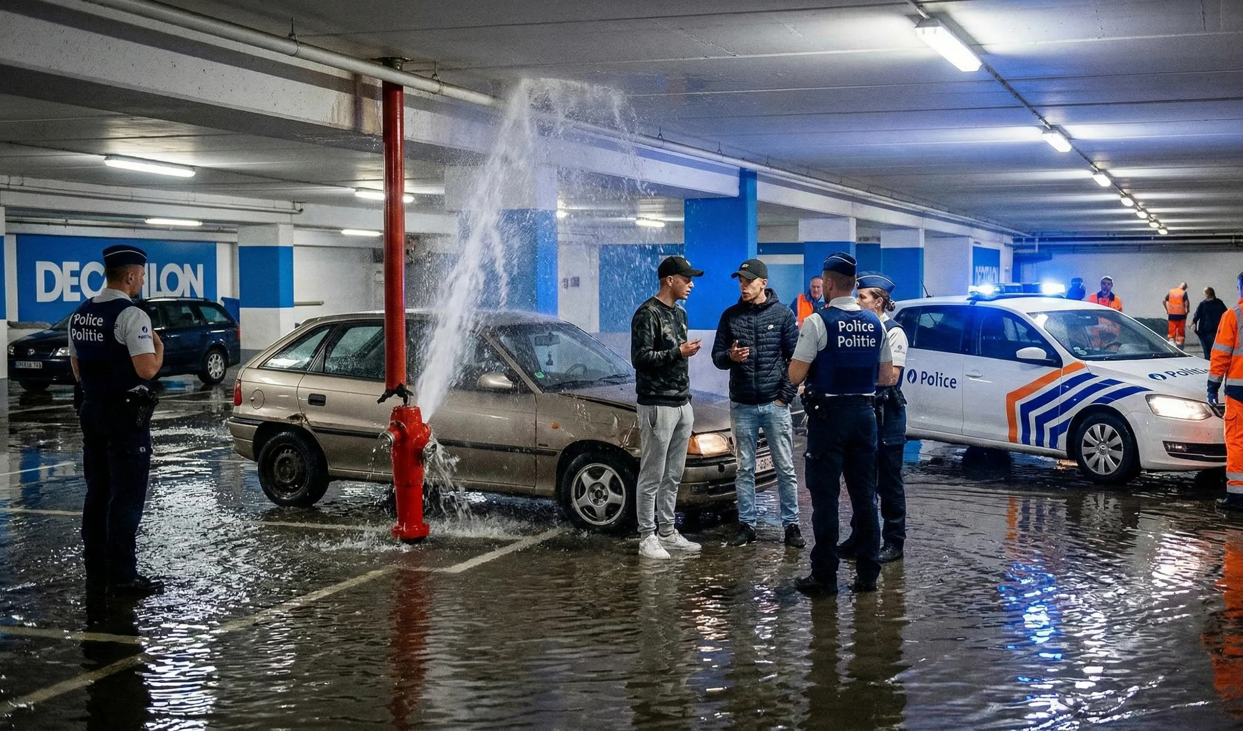 Drift na parkingu w Charleroi zakończył się zalaniem podziemi Decathlonu