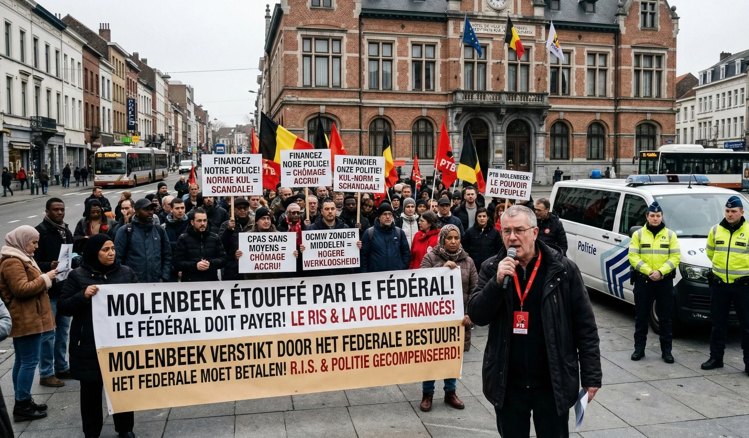 Pierwszy radny gminy Molenbeek Dirk De Block z partii PTB oświadczył w środę 4 marca 2026 r., że gmina jest „finansowo duszona” przez decyzje podejmowane na szczeblu federalnym, które przerzucają na samorządy coraz większe koszty. Według De Blocka niemal jedna trzecia budżetu gminy, wynoszącego około 250 milionów euro, pochłaniana jest przez wydatki wynikające z decyzji władz federalnych. Wśród najważniejszych obciążeń wskazał finansowanie policji lokalnej, koszty pomocy społecznej realizowanej przez CPAS/OCMW (ośrodek pomocy społecznej) oraz wydatki związane z systemem emerytalnym.