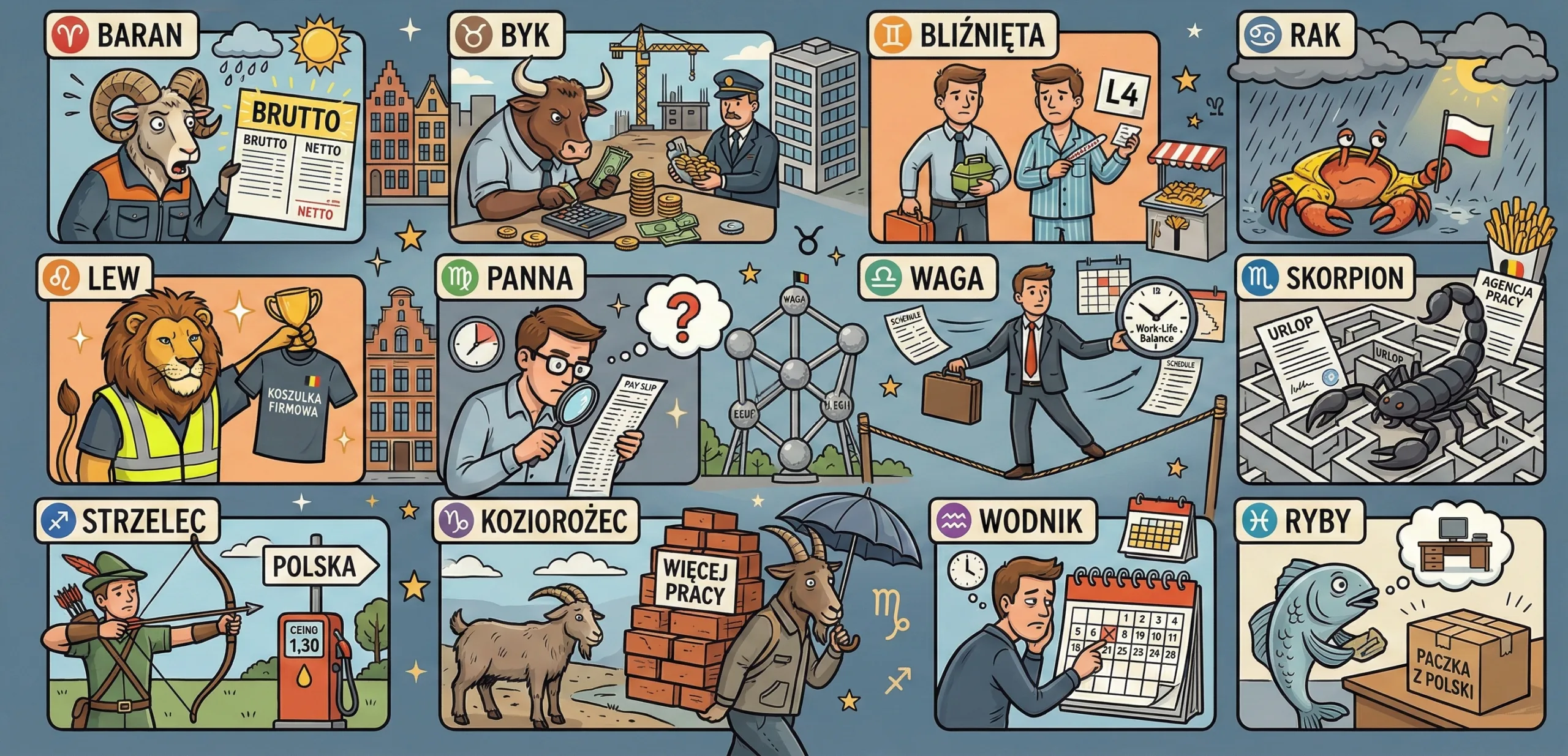 To astrologia dla mieszkańców Belgii – tych na budowie, w biurze, przy taśmie, w logistyce i na L4 „na chwilę”. Z przymrużeniem oka, ale bardzo życiowo.