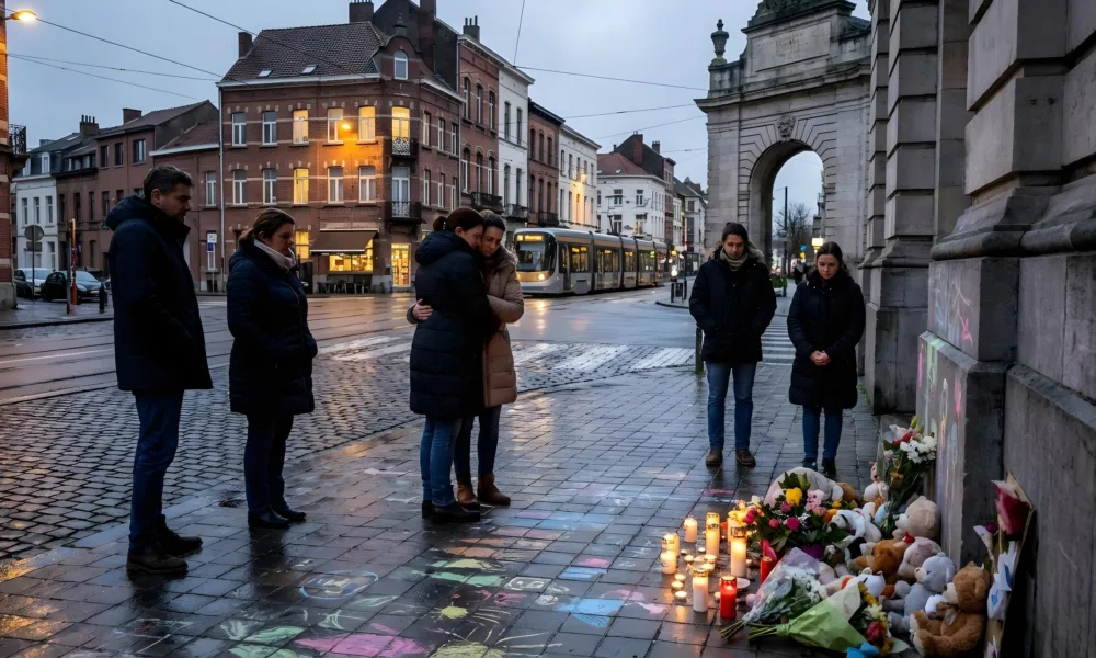 Wizualizacja SI - Aktualnosci.be We wtorek 17 marca 2026 r. późnym popołudniem przy Porte de Hal w Saint-Gilles odbyło się spotkanie upamiętniające Enzo – małego chłopca, który na początku marca zginął w wyniku potrącenia przez autobus. Inicjatywa wyszła od kolektywu obywatelskiego La Ville aux Enfants. Na miejscu zgromadzili się mieszkańcy, którzy przynieśli znicze, kwiaty, pluszowe zabawki oraz kolorowe kredy, aby oddać hołd dziecku i wyrazić wsparcie dla jego rodziny.