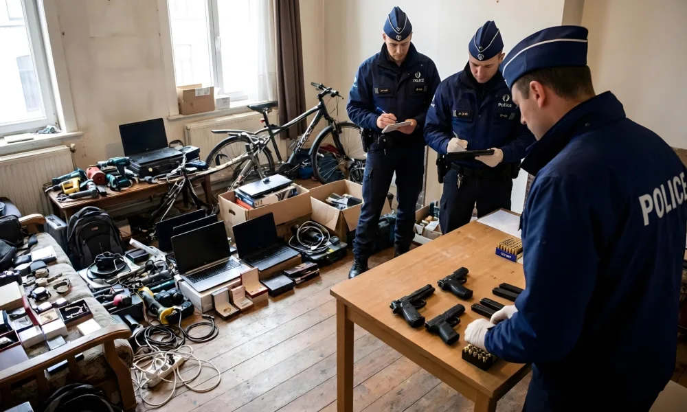 Wizualizacja SI - Aktualnosci.be Policja ze strefy Bruxelles-Capitale/Ixelles poinformowała w środę, 25 marca 2026 r., o zakończeniu sprawy, która doprowadziła do ujawnienia dużej liczby przedmiotów pochodzących z kradzieży. W mieszkaniu na Saint-Gilles funkcjonariusze odnaleźli około 300 rzeczy, które najprawdopodobniej zostały skradzione podczas różnych włamań. W trakcie przeszukania zabezpieczono również trzy jednostki broni palnej oraz amunicję. Do przełomu w dochodzeniu przyczyniła się czujność jednej z osób poszkodowanych, która rozpoznała swoją własność wystawioną na sprzedaż w internecie.