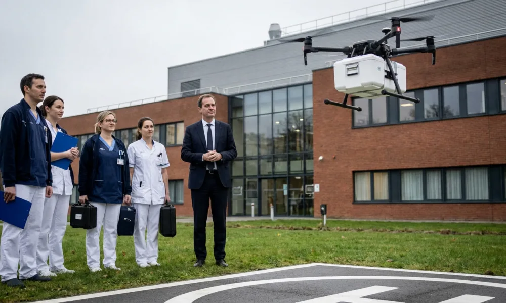 Wizualizacja SI - Aktualnosci.be CHU de Liège zaprezentował projekt wykorzystania dronów w logistyce szpitalnej. Podczas europejskiej konferencji SAFIR-Ready, która odbyła się 31 marca 2026 r. na kampusie Sart-Tilman, przedstawiono koncepcję transportu próbek biologicznych, produktów krwiopochodnych, biopsji oraz leków pomiędzy placówkami należącymi do szpitala. W wydarzeniu uczestniczył premier Bart De Wever, który podkreślił, że technologia dronów może być wykorzystywana nie tylko w kontekście militarnym, ale również w ochronie zdrowia i ratowaniu życia.
