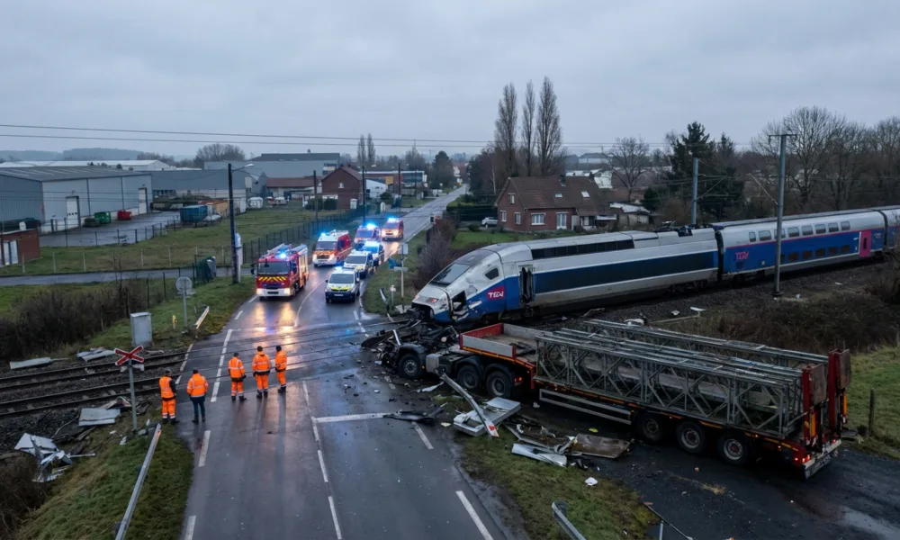 Wizualizacja SI - Aktualnosci.be We wtorek 7 kwietnia 2026 r. rano na przejeździe kolejowym w miejscowości Bully-les-Mines w departamencie Pas-de-Calais doszło do poważnego zderzenia pociągu TGV z ciężarówką przewożącą wojskowy most pontonowy. W wyniku zdarzenia zginął maszynista, a 16 osób zostało rannych. W środę 8 kwietnia prokuratura w Béthune poinformowała o postawieniu kierowcy ciężarówki zarzutu zabójstwa drogowego i objęciu go dozorem sądowym.