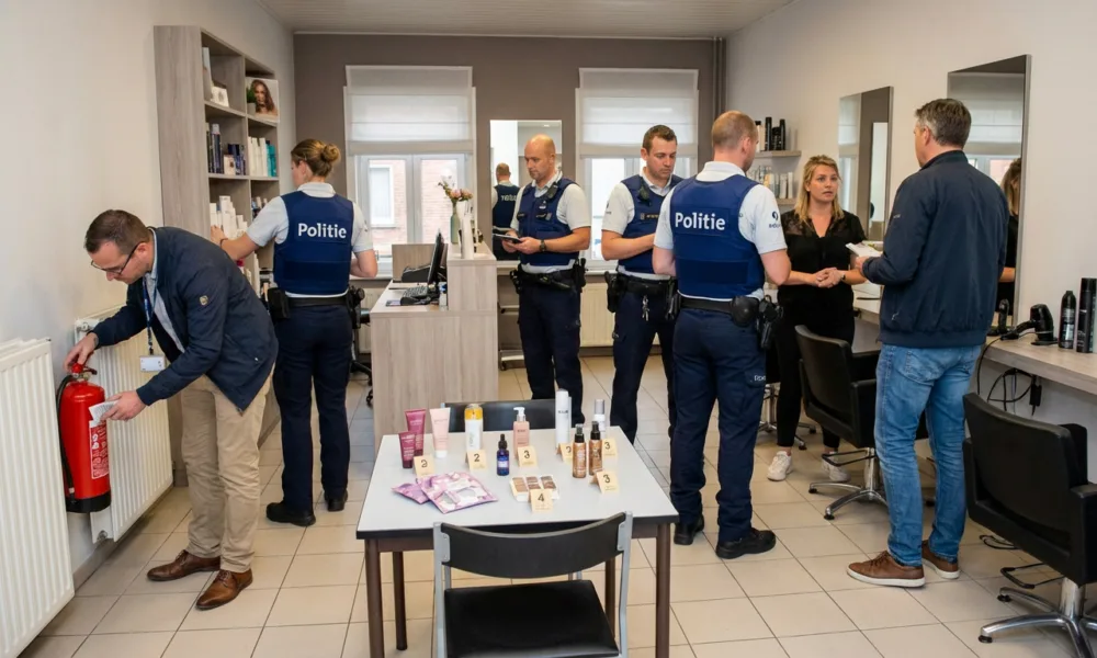 Wizualizacja SI - Aktualnosci.be Podczas kontroli przeprowadzonych w środę 1 kwietnia 2026 r. w sześciu salonach fryzjerskich i barberskich w Herk-de-Stad w prowincji Limburgia zabezpieczono łącznie 289 produktów kosmetycznych niedopuszczonych do obrotu w Belgii. Inspekcje wykazały także naruszenia przepisów prawa pracy oraz uchybienia w zakresie bezpieczeństwa przeciwpożarowego we wszystkich skontrolowanych lokalach.