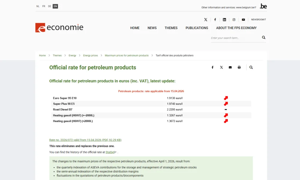 https://economie.fgov.be/en/themes/energy/energy-prices/maximum-prices-petroleum/official-rate-petroleum Kierowcy w Belgii muszą przygotować się na kolejne wzrosty cen paliw. We wtorek 14 kwietnia 2026 r. podrożały zarówno benzyna, jak i olej napędowy, a w środę 15 kwietnia ceny benzyny wzrosną jeszcze bardziej. Podwyżki obejmą także olej opałowy – wynika z najnowszych maksymalnych taryf opublikowanych przez Federalne Ministerstwo Gospodarki (SPF Économie/FOD Economie).