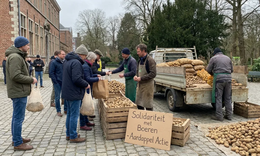 Wizualizacja SI - Aktualnosci.be W sobotę rolnicy z całej Flandrii otworzyli swoje gospodarstwa dla osób chcących kupić ziemniaki bezpośrednio od producenta w atrakcyjnych cenach. Akcja wsparcia dla branży odbyła się między innymi w Kortrijk, Gandawie, Antwerpii, Hasselt i Leuven. Sektor zmaga się obecnie z bardzo dużą nadwyżką plonów, przez co ceny skupu pozostają na niskim poziomie. W belgijskich magazynach zalega około 860 000 ton ziemniaków, które wciąż nie znalazły nabywców.